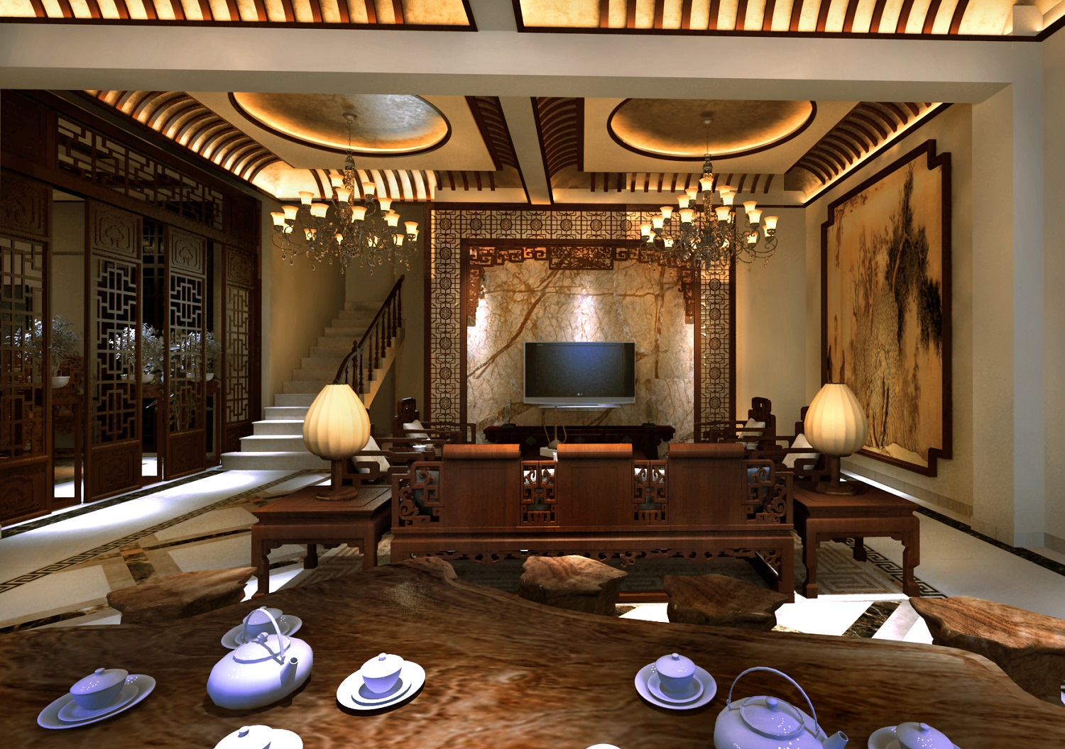 呈现原汁原味的中式风格,设计师将许多中式元素运用的淋漓尽致。水墨画背景的电视背景墙,做工精细的古典家具,精美雕花的门窗,以及深沉典雅的家居基调,无不让人沉迷于这浓浓的中式风情。