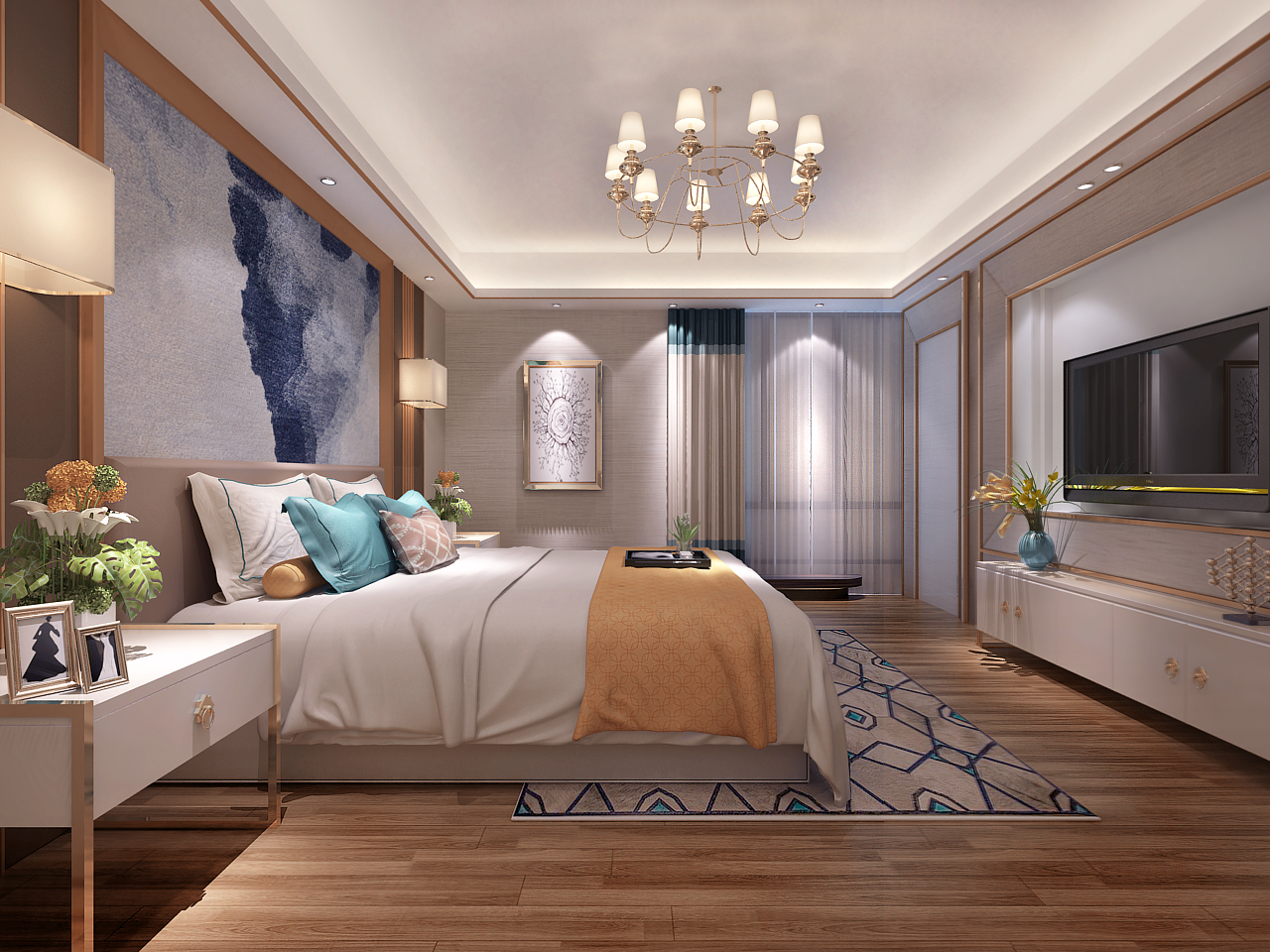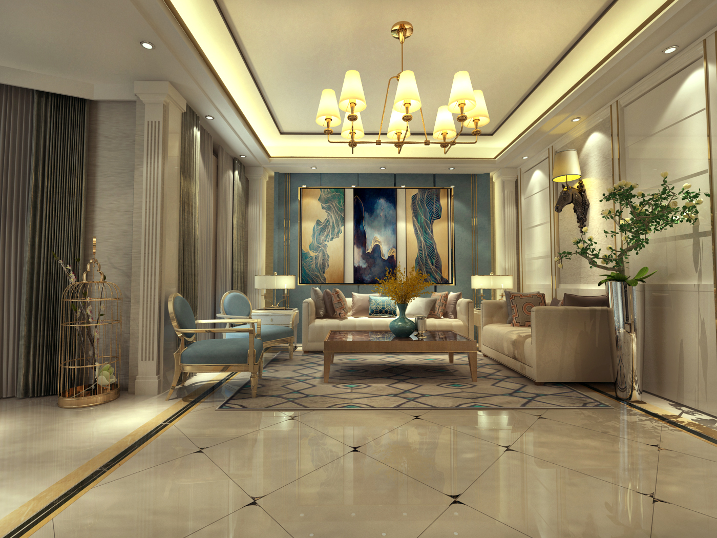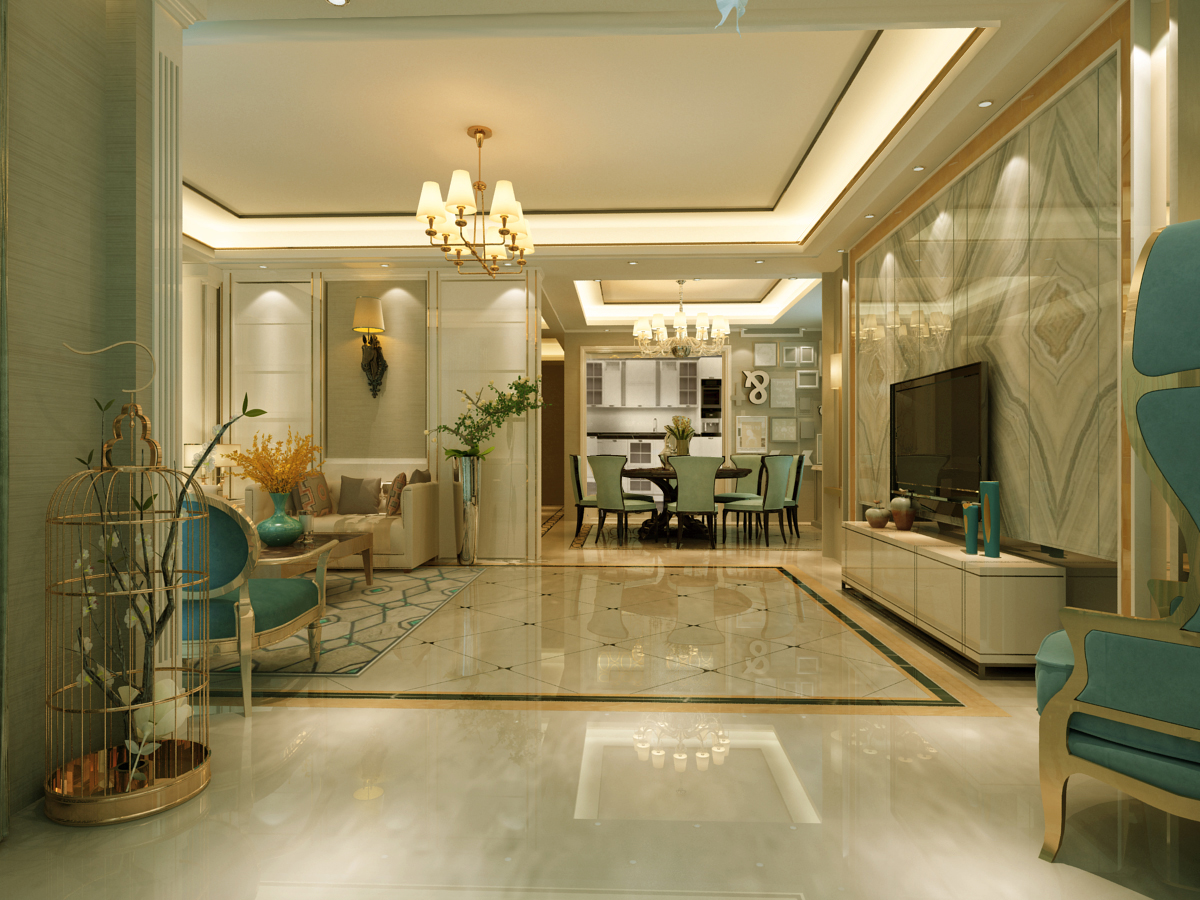以后现代风格为基础,通过低调雅致的色彩搭配和简洁优雅的设计,展现出时尚又大气的居家空间。从房间进入,大理石的隔断墙便引领出奢华气度。公共区域以浅色地砖的铺设扩大空间的明亮度,大理石材质的电视墙也与玄关呼应,展现大气轻奢的美感。