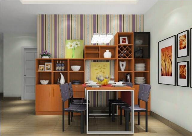在客餐厅有一个大的角落,设计师贴墙做了一个开放式的餐边柜,搭配餐桌椅将其打造成一个用餐区,很好地利用了角落位置,也满足了居家需求!